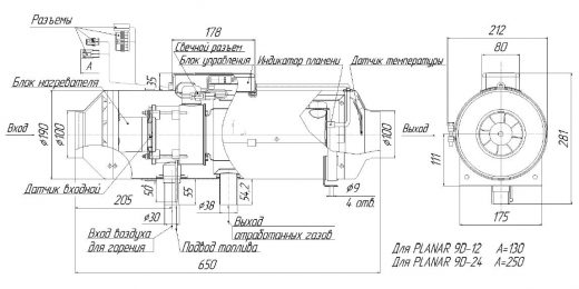 Отопитель PLANAR 9D не предусматривает дальнейшего подключения системы воздуховодов в целях защиты от перегрева изделия. Выходной мощности отопителя в 8 кВт достаточно для того, что бы за час прогреть объём воздуха в 290 куб.м.